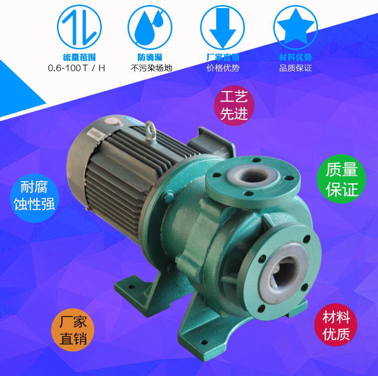 氟塑料磁力泵又稱其為氟塑料磁力離心泵、襯四氟磁力泵、氟塑料磁力驅動泵、耐腐蝕磁力化工泵,CQB-FJ襯氟磁力泵是我公司氟塑料磁力泵中的全新升級款型,產品性能好,運轉更加穩定,材質更好,全封閉無泄露,適合現代化的環保要求。