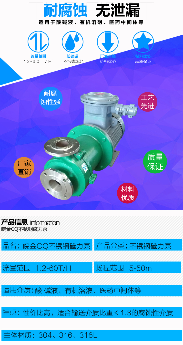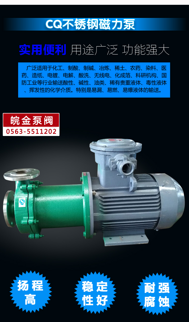 不銹鋼磁力泵又稱其為磁力離心泵、不銹鋼磁力驅動泵、耐腐蝕磁力化工泵,CQ不銹鋼磁力泵是金屬磁力泵中的經典結構款型。