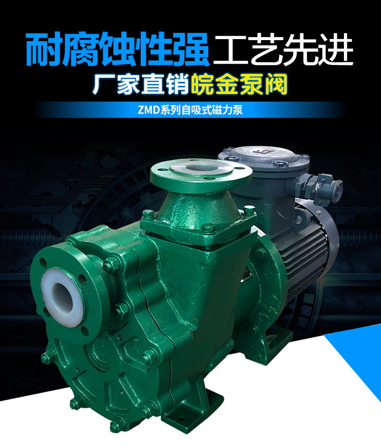 ZMD氟塑料磁力自吸泵又稱其為氟塑料自吸磁力泵、襯氟磁力自吸泵、耐腐蝕自吸化工泵,ZMD襯氟磁力自吸泵具有磁力泵和自吸泵的特性,同時兼具良好的自吸功能。按照國標設計研發可以輸送低位介質、罐車原料裝卸、氣液混合介質。過流部件緊襯氟塑料,泵體為金屬材料,能夠承受管道重量。取消軸封,利用磁力間耦合驅動,不會滴漏現象,保障工況安全生產。
