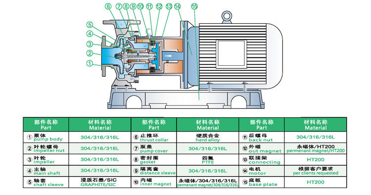 WJC不銹鋼磁力泵過流部件采用全不銹鋼材料(304、316、316L),內、外磁轉子選用高磁能積、高矯頑力的稀土永磁制造,具有高效節能、介質適用面廣、耐高溫、磁性強、不退磁等