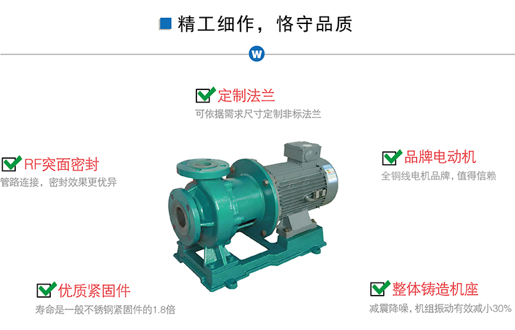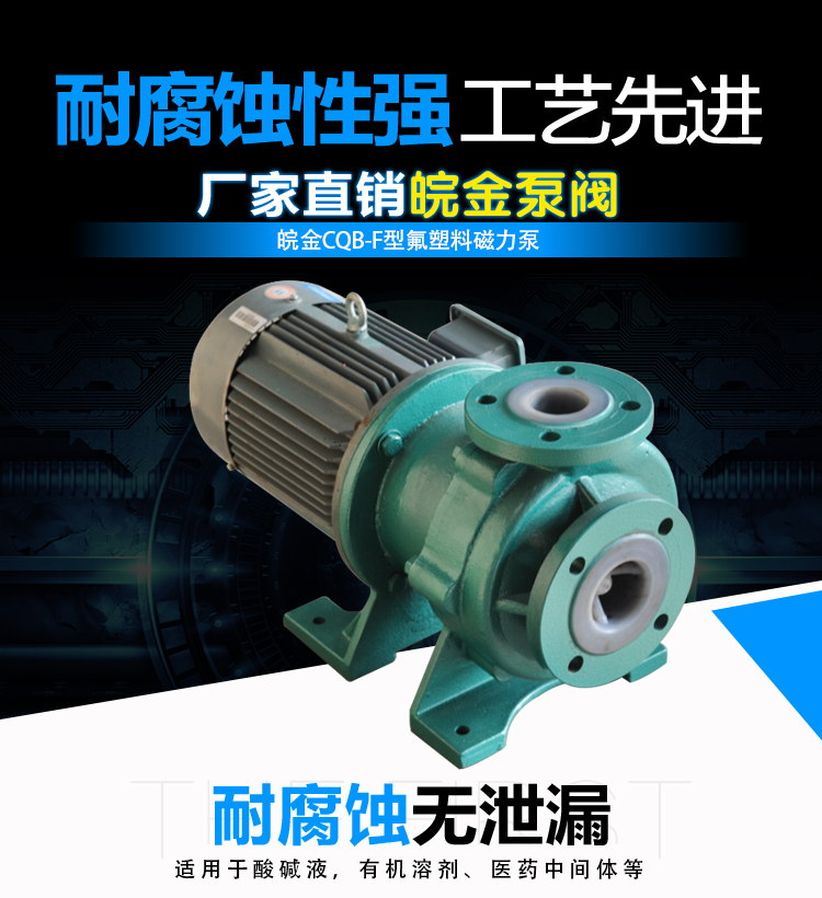 氟塑料磁力泵又稱其為氟塑料磁力離心泵、襯四氟磁力泵、氟塑料磁力驅動泵、耐腐蝕磁力化工泵,CQB-FJ襯塑磁力泵是我公司氟塑料磁力泵中的全新升級款型。氟塑料磁力泵另有:CQB-F經典型、CQB-FA長支架型、IMD后拉式重型。