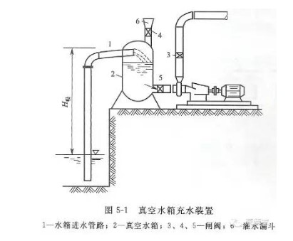 用水泵真空引水裝置充水時,先打開閘閥3、4、5,從漏斗6向水箱2中灌水至水箱進水管路下緣齊平后,關閉閘閥3和4,即可啟動水泵。水泵啟動后,打開閘閥3,水箱中水位下降,齊平后,關閉閘閥3和4,即可啟動水泵。水泵啟動后,打開閘閥3上部形成一定的真空值,進水池中的水沿水箱進水管路不斷進入水箱過程。